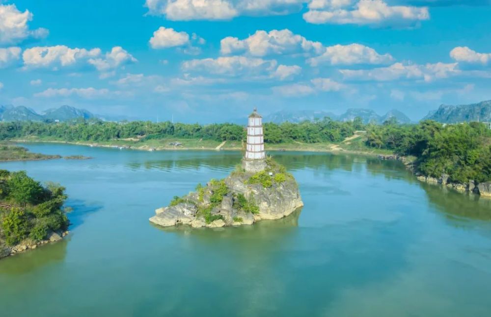 左江斜塔位于崇左市江州区太平镇大村归龙滩左江中心河道鳌头山上,东近杀狗岭,西望半边山。每当台风袭击,洪水泛滥,灾祸逐步,古人以为有妖龙作孽,建塔镇之,故早期取名为“镇海宝塔”,是广西壮族自治区明清两朝众多砖塔中最有特色的一座,被誉为广西最美的十大古建筑之一。