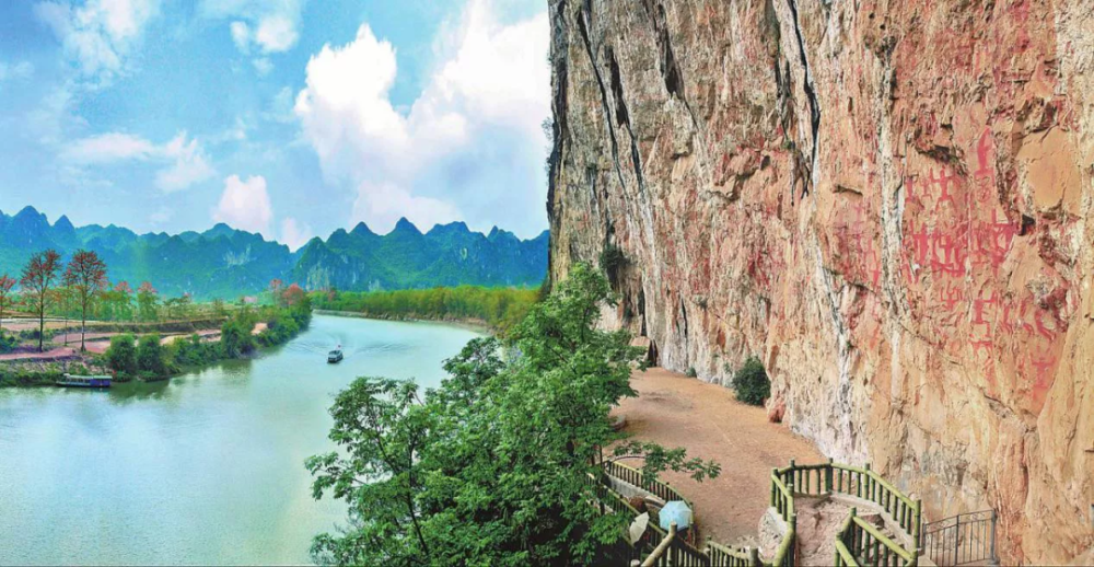 乘舟漫游明江河,在河畔看那岩壁上的“无字天书”,感受消逝久远的骆越社会生活情景。岩壁上留存于的图案,由壮族骆越先民绘制而成,图像众多、场面壮观、规模宏大。2016年7月15日,左江花山岩画文化景观成功列入《世界遗产名录》,成为中国首个岩画类世界文化遗产、广西第一个世界文化遗产。