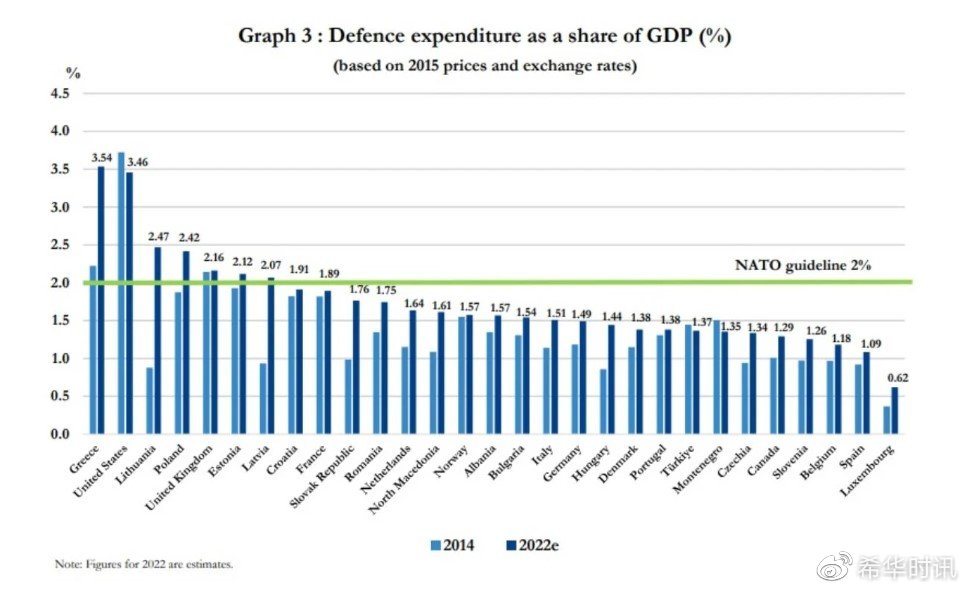 具体数据显示,在30个北约盟国中,共有7个国家的军费开支占GDP2%以上。其中,希腊在2022年国防开支占GDP的3.54%,高居首位。美国国防开支占GDP的3.46%,位居第二。随后是立陶宛、波兰、英国、爱沙尼亚同拉脱维亚,上述国家均已达到北约国家国防开支占GDP2%的指导方针。