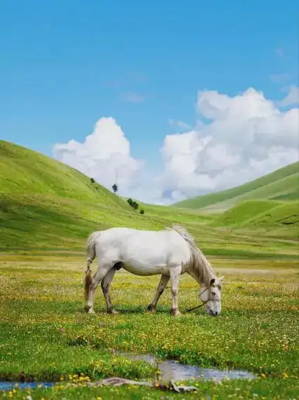 每到夏季,整个草原碧绿如茵、繁花似锦。