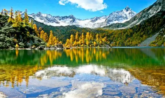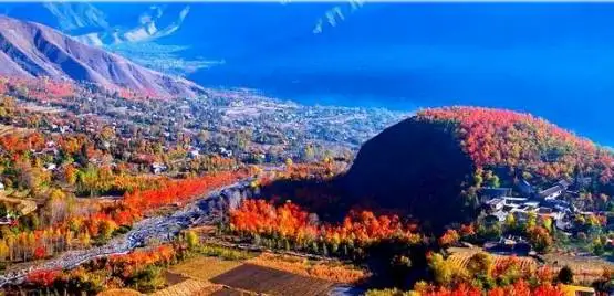 火红的枫叶,翠绿的松柏,金黄的桦树林及蓝天白云、皑皑雪峰交相辉映。天堂谷的秋天,像艺术大师精心绘出的一幅幅绝伦无比的经典画作,让你不敢相信自己眼里看到的美景,居然真实的存在。