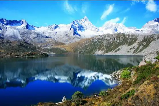 蓝天白云、雪峰皑皑、冰川闪烁、青山融融、绿草茵茵、波光粼粼。湖岸珍离异兽出没,湖中野鸭成群,鱼儿游弋。 夏秋季节,山花烂漫,争芳斗艳,真可谓世间仙境。