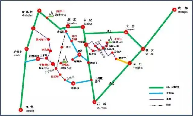 A1:成都-雅安-天全-泸定-康定-新都桥-沙德乡-贡嘎山乡-上木居-子梅垭口(全程526公里)