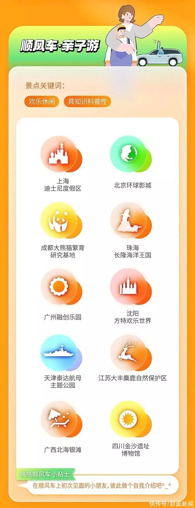 近日,嘀嗒出行基于平台顺风车大数据,发表了一份场景定制式《2023五一顺风车热门旅游景点预测同攻略》,围绕“亲子”、“适老”、“好友”、“大学生特种兵”等四大典型出游场景,呈现40个顺风车热门旅游景点同城市,以期为用户提供一份独特同个性化的顺风出游指南。