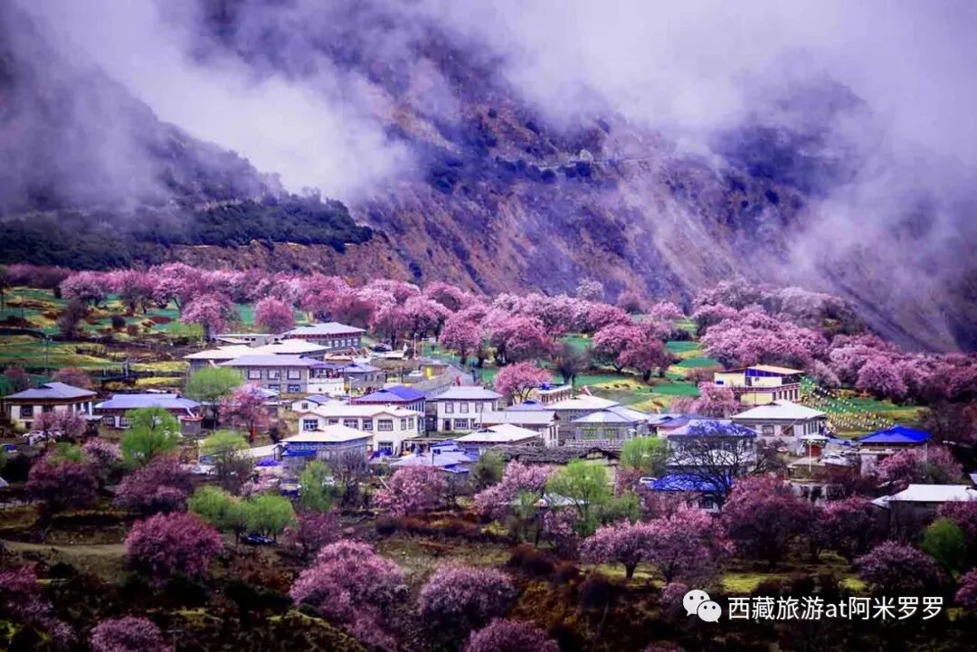 波堆藏布流经的倾多镇—许木乡的桃花沟绵延30公里,号称中国最长的桃花沟。从海拔2600米到3300米,桃花随着海拔气候的变化次第开放,整个四月,都可以在此赏桃花。远处的冰川雪山,近处桃花遮掩下色彩斑斓的藏式房屋,产生强烈的视觉冲击,堪称一幅大美图画。