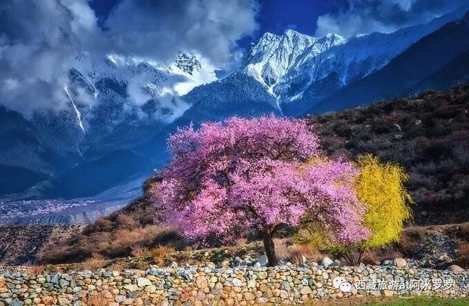 粉嫩的桃花,在气势磅薄的雪山怀抱中无限柔媚。