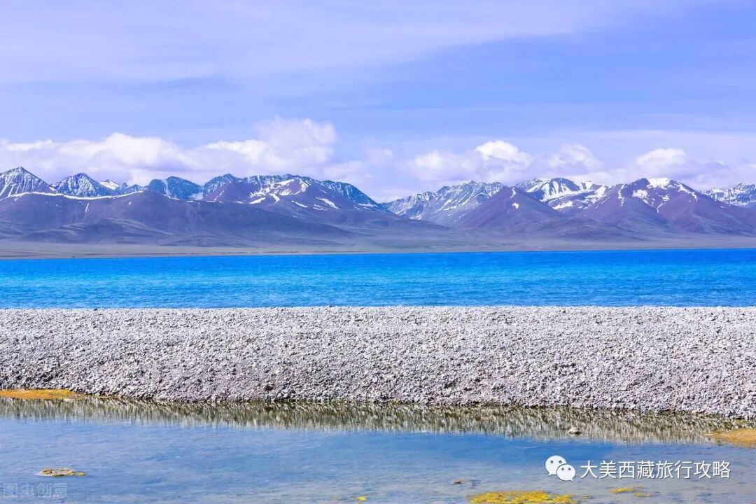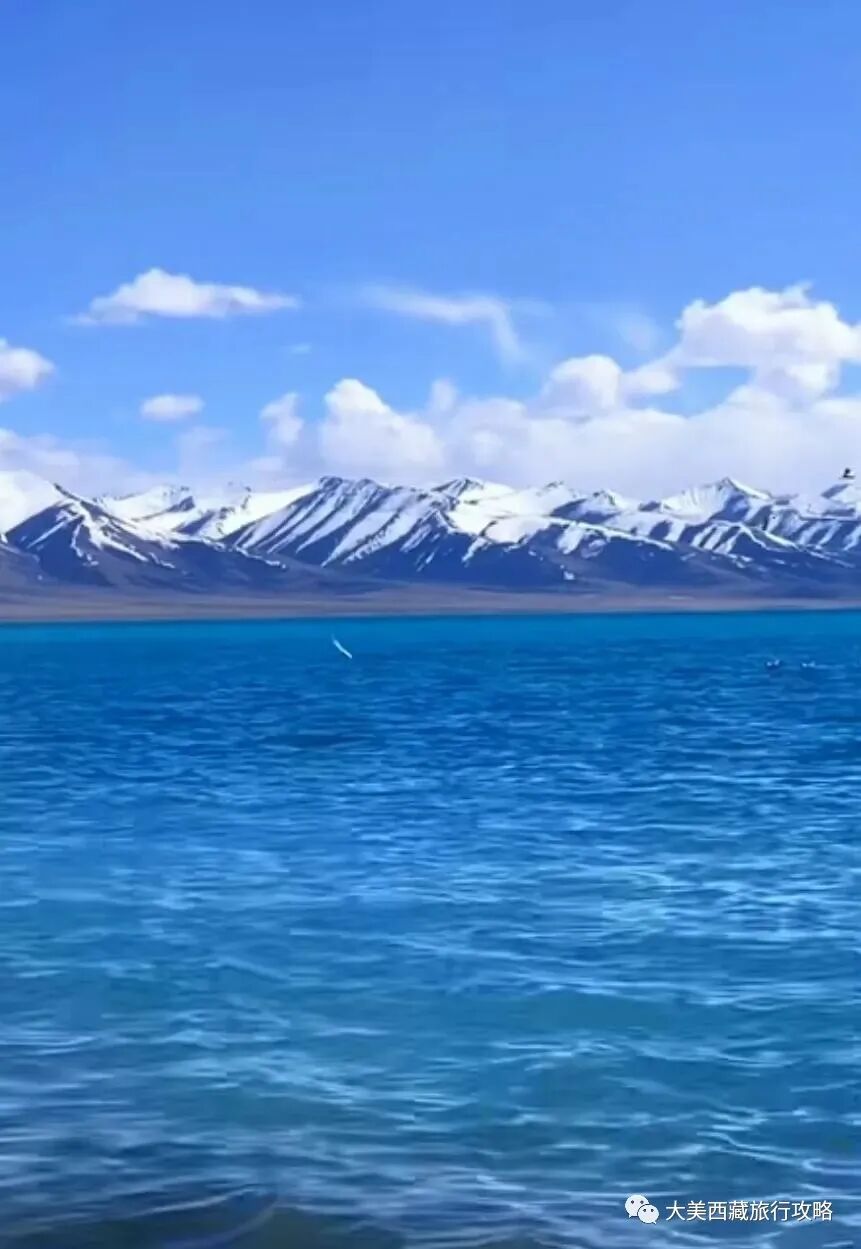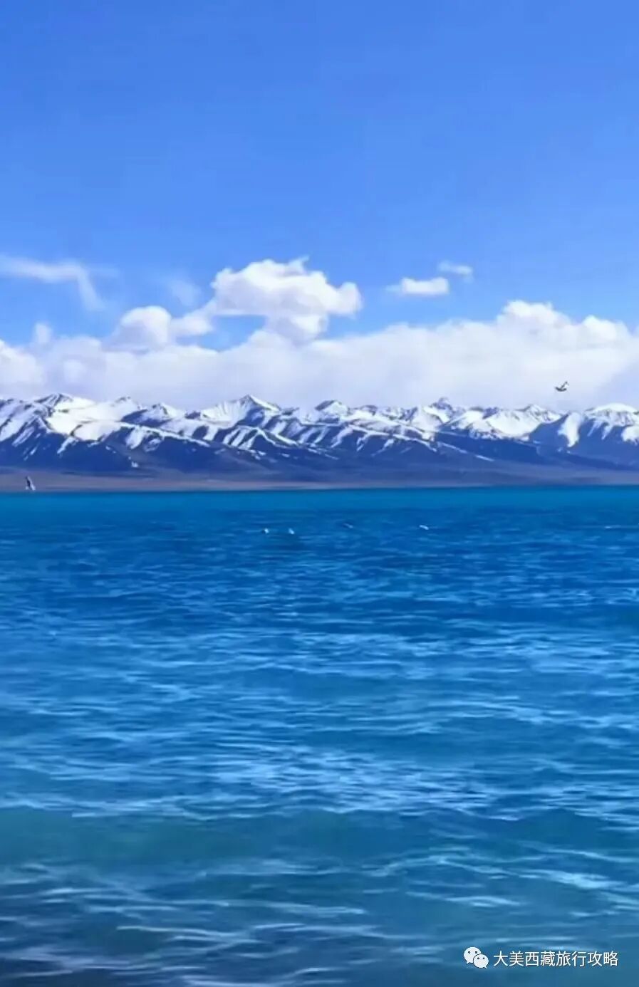 蓝色的海,泡芙般的云,白白的雪山,温柔的海风,站在纳木措湖边,放眼望去,蜿蜒巍峨的念青唐古拉雪山将纳木错湖拥抱在怀里。