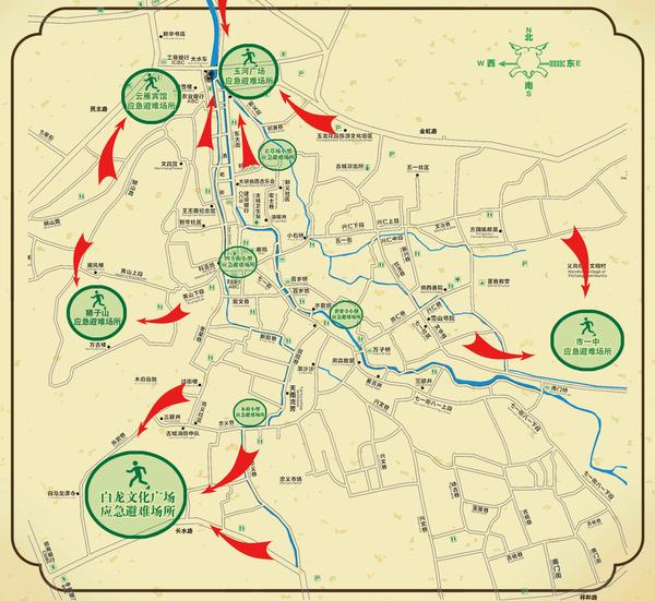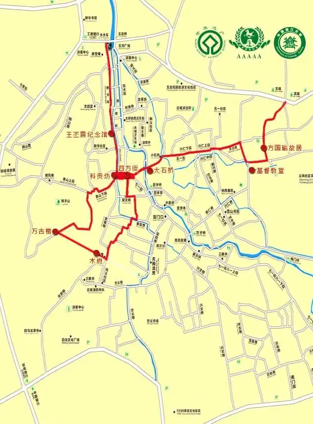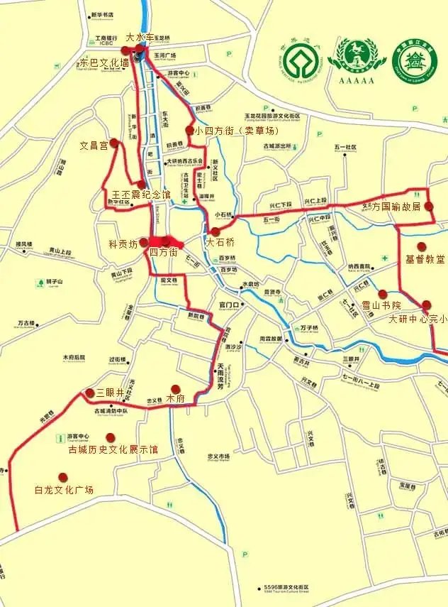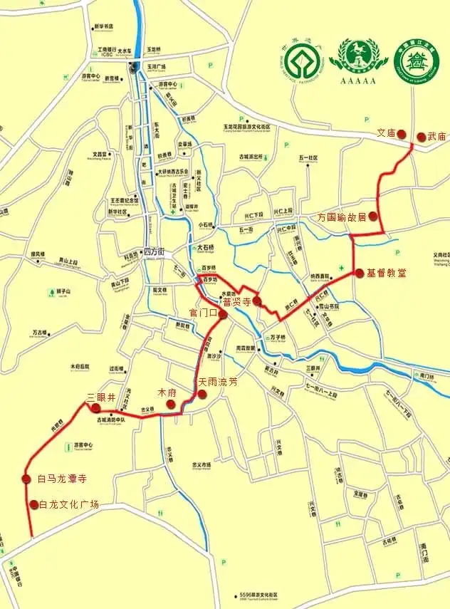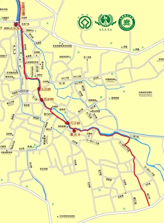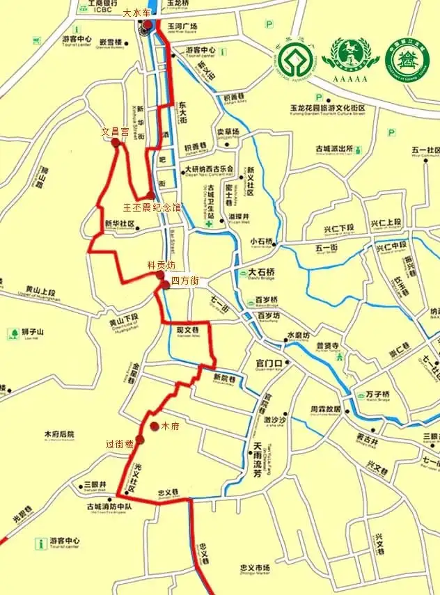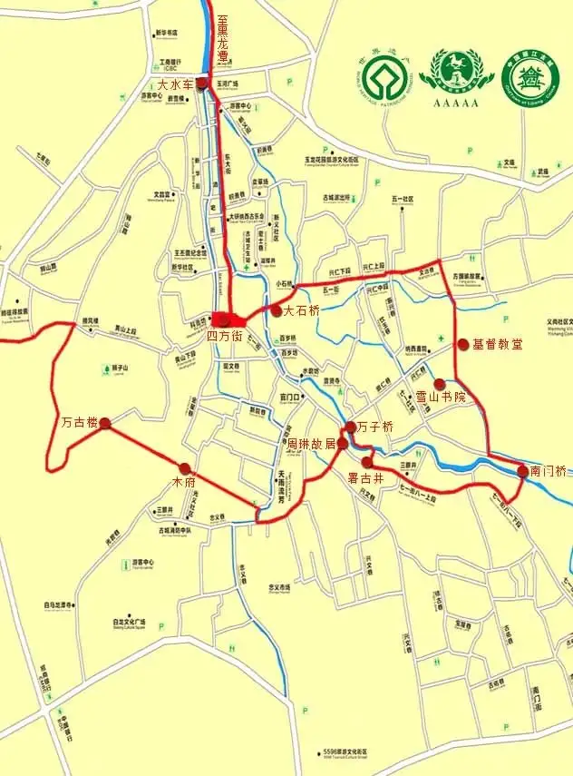从古城水的出口南门开始,到古城水源头黑龙潭结束。