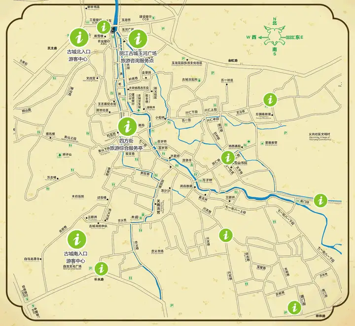 玉河广场旅游咨询服务点:古城北入口大水车东南侧。古城北入口游客中心:古城西北部背靠狮子山双石公园。四方街旅游综合服务亭:四方街及东大街的交汇处。七一街旅游综合服务亭:七一街崇仁巷及王家庄巷交汇处。南门旅游综合服务亭:古城南门宝屋巷。