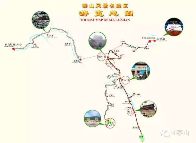 该路线途径:岱庙——岱宗坊——红门宫——万仙楼——斗母宫——经石峪——壶天阁——回马岭——中天门——快活三里——云步桥——五大夫松——十八盘——南天门——天街——碧霞祠——唐摩崖——五岳独尊——玉皇顶——拱北石
