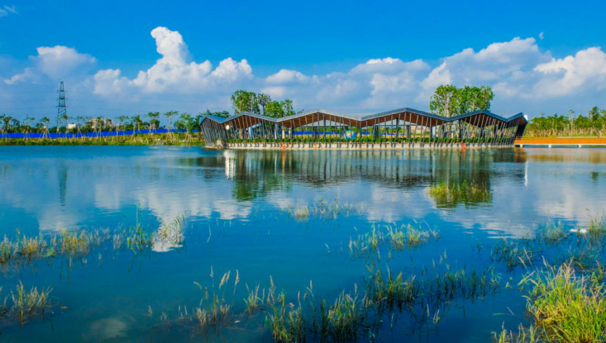 以水域生态为主的公园,园内草坪翠绿、树荫成片,天气晴朗之际,同亲朋好友一起悠然漫步在美景当中,领略大自然的无穷魅力。