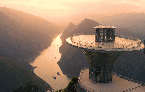 13: 00 巫峡口县城游客接待中心乘坐缆车或者乘坐专线旅游大巴抵达山顶景区。在这里,鸟瞰巴东县城全景,走玻璃栈道,登灵芝仙台,看长江90度大拐弯,这里是“心”被长江拐走的地方。