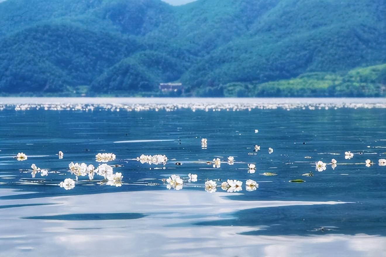 此时的泸沽湖湖面上,能看见一朵一朵的像睡莲一样的小白花。这便是有名的奇景:水性杨花。