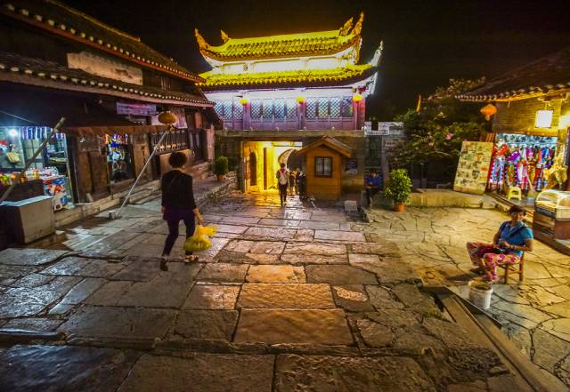 600多年的岁月无声滑过,城墙的垛口上 还能依稀听见雄姿英才的嘶鸣,满城的商幡招 展已是俗世的繁华热辣。游客的来访让古镇再 度热闹起来:满街俯拾皆是“青岩猪脚”、“玫瑰糖”、“老腊肉”诱人口水,山货时鲜、酒肆 茶铺、古董工艺、百货杂陈,仿佛又回到了驿 道上商贾云集的旧时光,只是不经意间仍会瞥 见那些陈旧陈旧的石柜台和木柜台,泄露了古镇悠远的身世。
