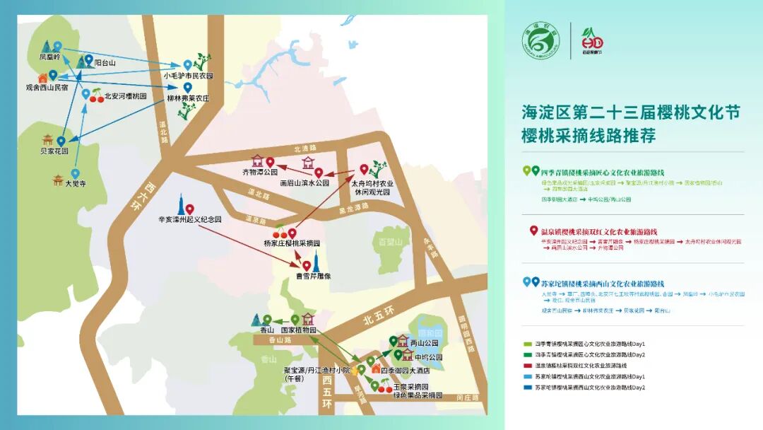 海淀深挖历史文化积淀,坚持农业与科技、教育、文化、旅游融合发展思路,将樱桃采摘与海淀的文化旅游资源、网红打卡地结合,打造“好玩、好吃、好看”的海淀休闲农业旅游生活。大会上推荐樱桃采摘旅游路线三条:分别为四季青镇匠心文化农业旅游路线、温泉镇红色红楼双红文化农业旅游路线和苏家坨镇西山文化农业旅游路线。