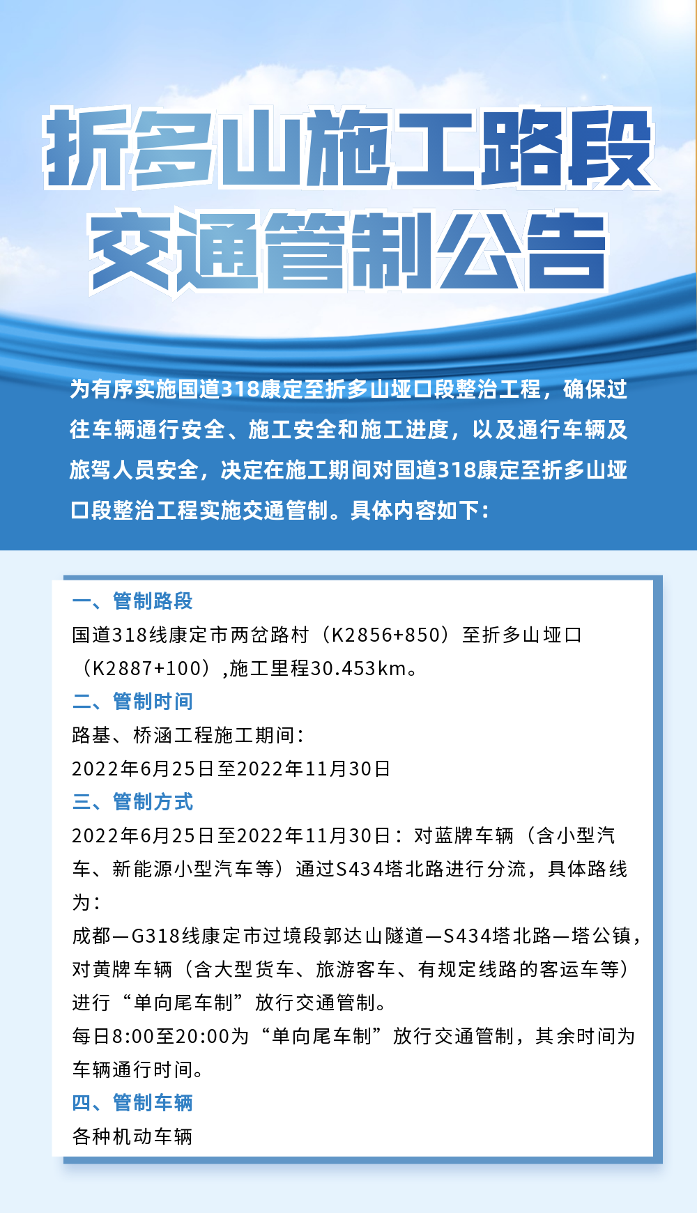 甘孜公安交警特别发布来州旅游绕行路线,同时全州公安交警将按照州委、州政府、州局党委的安排部署,最大程度将警力下沉一线,全力疏导交通,为您的安全出行保驾护航!折多山交通管制公告及绕行建议