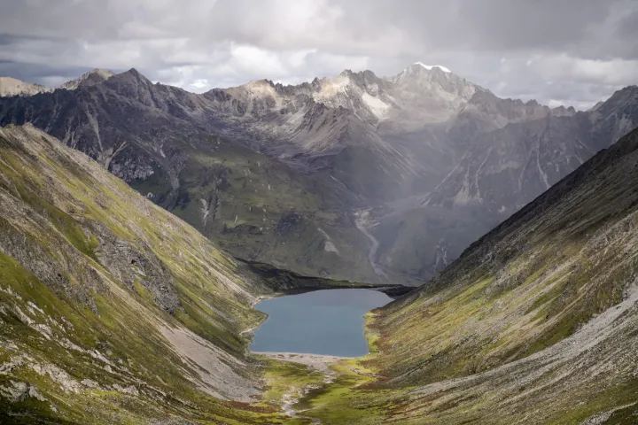 是位于丛山之中的一座高山湖泊,在藏语中的意思是“天女之魂湖”,它的形状近似人的头盖骨,藏族人认为它是吉祥天女的颅骨所化。